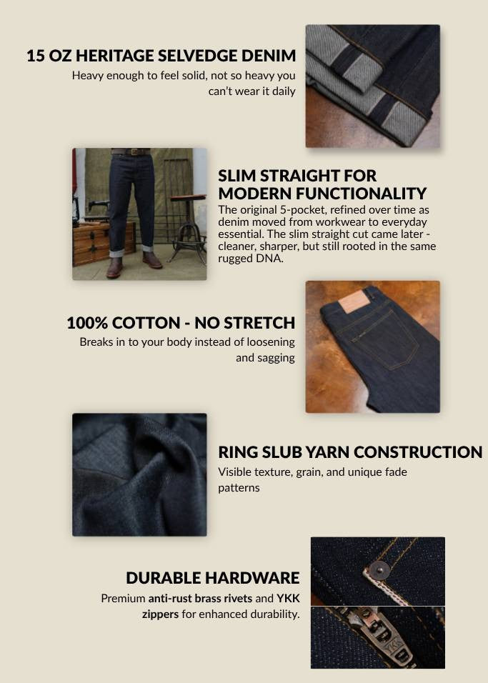 The 5 pocket slim straight comes from the same place as the original workwear denim, it was built tough and made to last. But over time, the way people wore denim changed.
