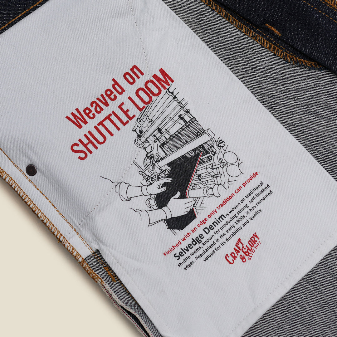 • Fabric: 100% cotton, 15 oz indigo selvedge denim.
