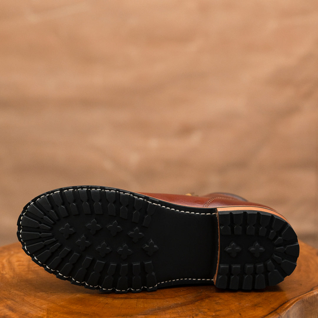 Highest quality natural rubber sole with deep lugs for ultimate traction and abrasion. Stacked leather heels. Sole is handstiched to the welt. Great for outdoors and all day wearing.