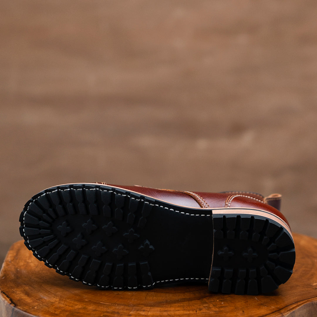 Highest quality natural rubber sole with deep lugs for ultimate traction and abrasion. Stacked leather heels. Sole is handstiched to the welt. Great for outdoors and all day wearing.